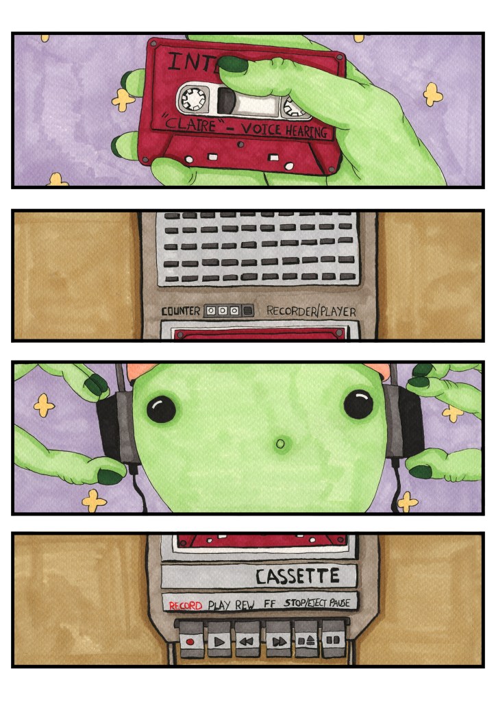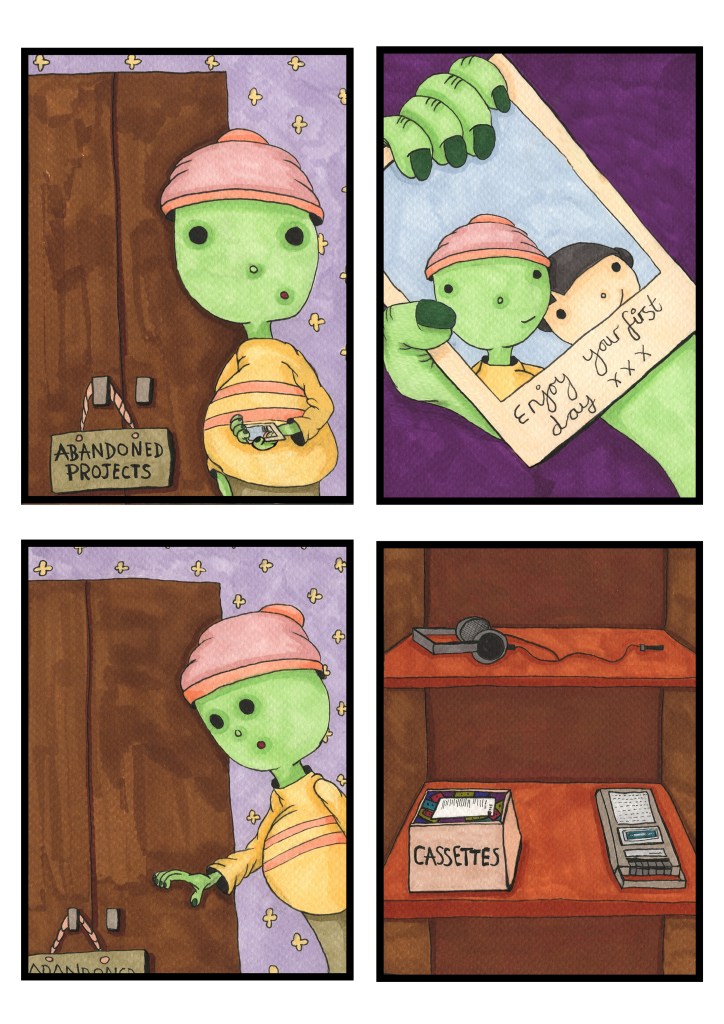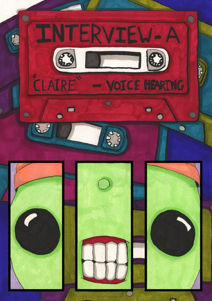 Interview ABC is a 32 comic book zine that looks at mental health from an experimental and investigative perspective. It follows an unnamed character who starts work at a radio station. He finds some old cassettes tapes that feature a series of interviews. The character listens to the tapes and realizes he is hearing interviews from an abandoned radio documentary on mental health. The character draws parallels with their own life and looks to learn from the tapes and express self-care. The story draws on my own experiences with mental health.