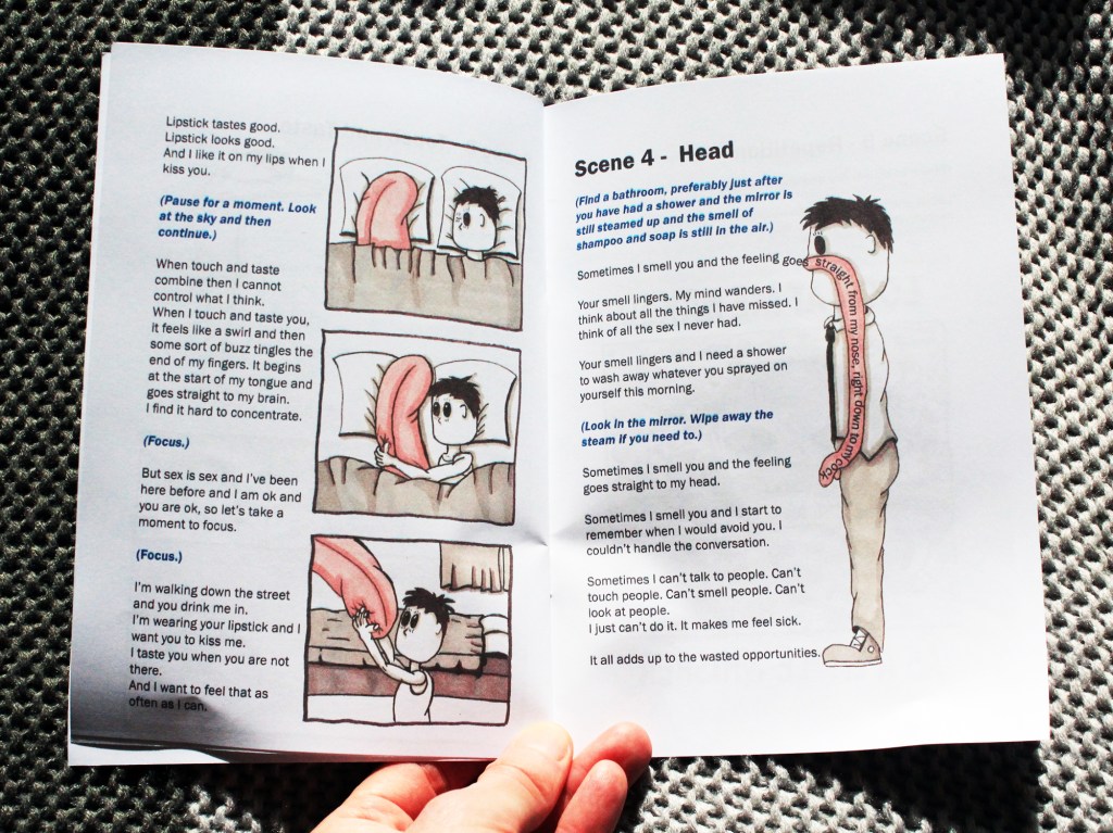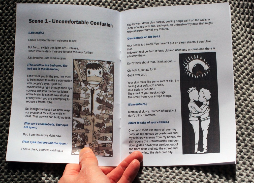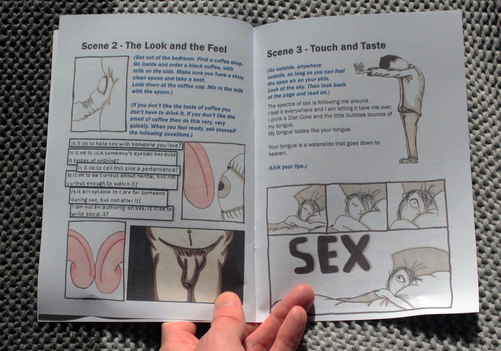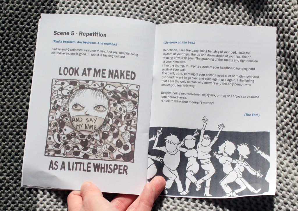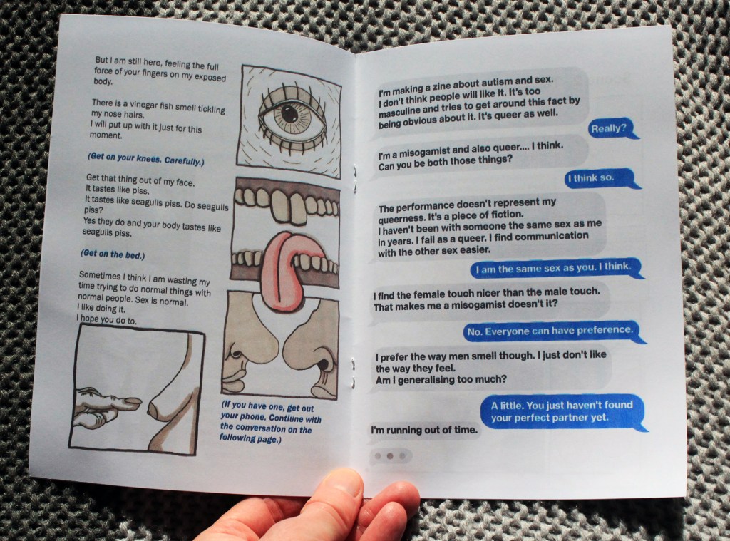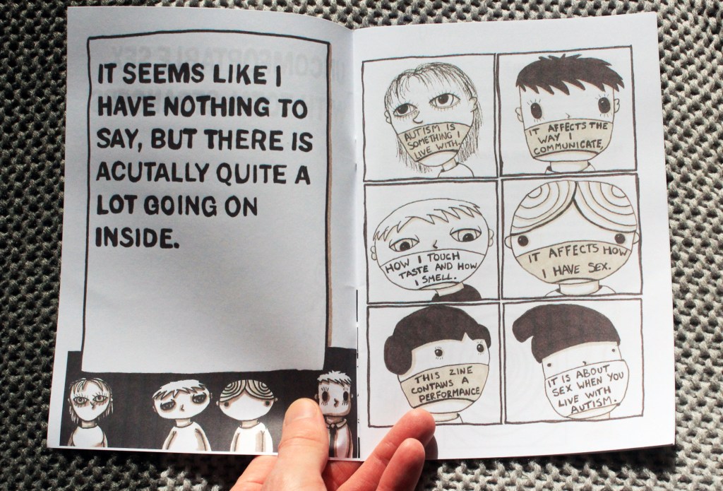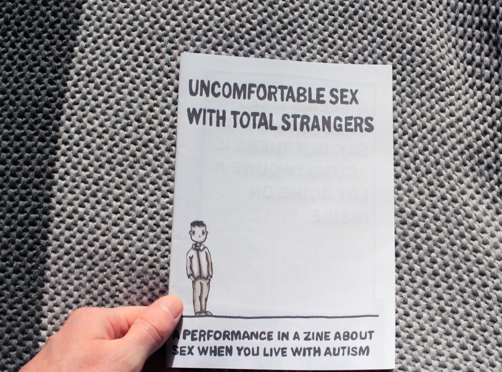 Uncomfortable Sex With Total Strangers is a personal zine that looks at sex when you live with autism. It features illustrations, short stories, comics and a performance script that you can act out. Uncomfortable Sex With Total Strangers takes a queer perspective on autism and sex and looks at what makes sex and sexuality special, different and frustrating when you are neuro-divergent. The story is personal, original and exciting. The performance aspect gives the reader a deep insight into the topics covered.